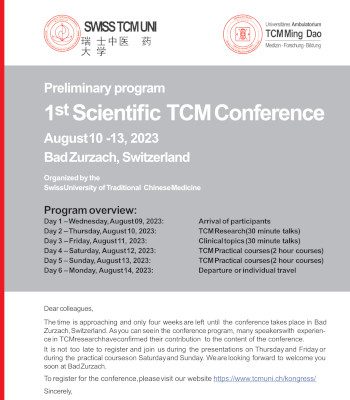 Past Congress 2nd Scientific TCM Conference Aug. 15th to 18th, 2024 Bad Zurzach, Switzerland 1st Scientific TCM Conference August 10th to 13th, 2023 Bad Zurzach, Switzerland Internationaler Jing Fang TCM KongressSeptember 7th to 10th, 2019 Bad Zurzach, Switzerland